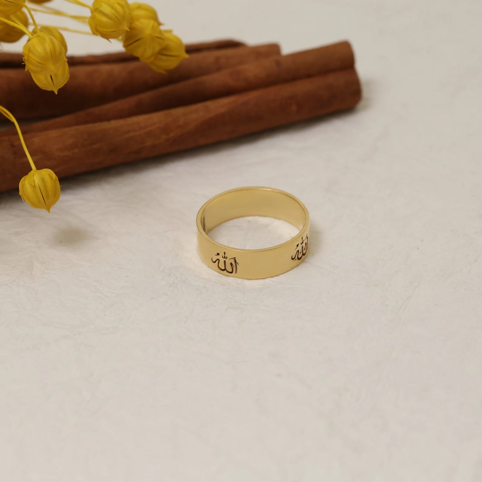 The Arabic Allah Engraved Band Ring features a beautifully detailed engraving of "Allah" in elegant Arabic calligraphy. Crafted with care, this ring combines spirituality and style, making it a meaningful accessory for everyday wear or a thoughtful gift.