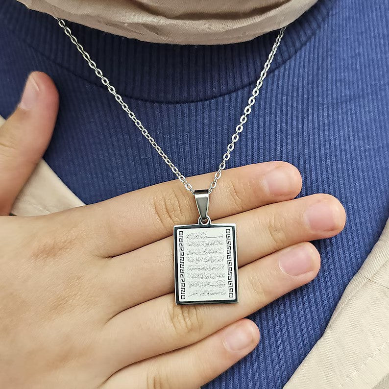 The Ayatul Kursi Square Pendant Necklace beautifully showcases the powerful Quranic verse, Ayatul Kursi, in a sleek square pendant design. This elegant piece symbolizes divine protection, faith, and spiritual strength, making it a meaningful accessory for everyday wear or a thoughtful gift. Crafted with attention to detail, it blends modern style with deep spiritual significance.