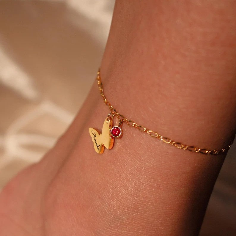 The Butterfly Name Birthstone Anklet features a delicate butterfly charm alongside a personalized name and birthstone. This charming anklet adds a touch of individuality and meaning, making it a perfect accessory for everyday wear or a thoughtful gift for someone special.