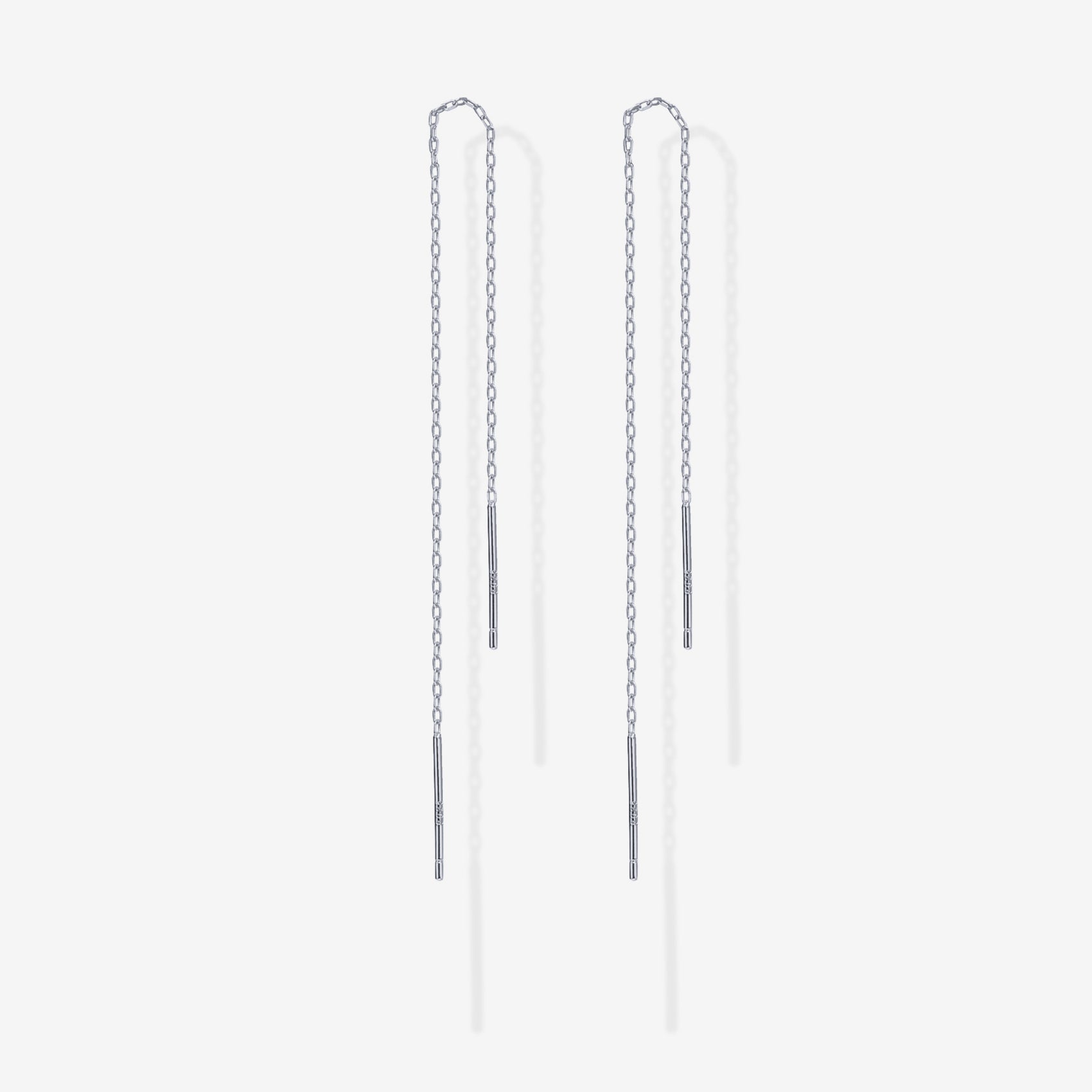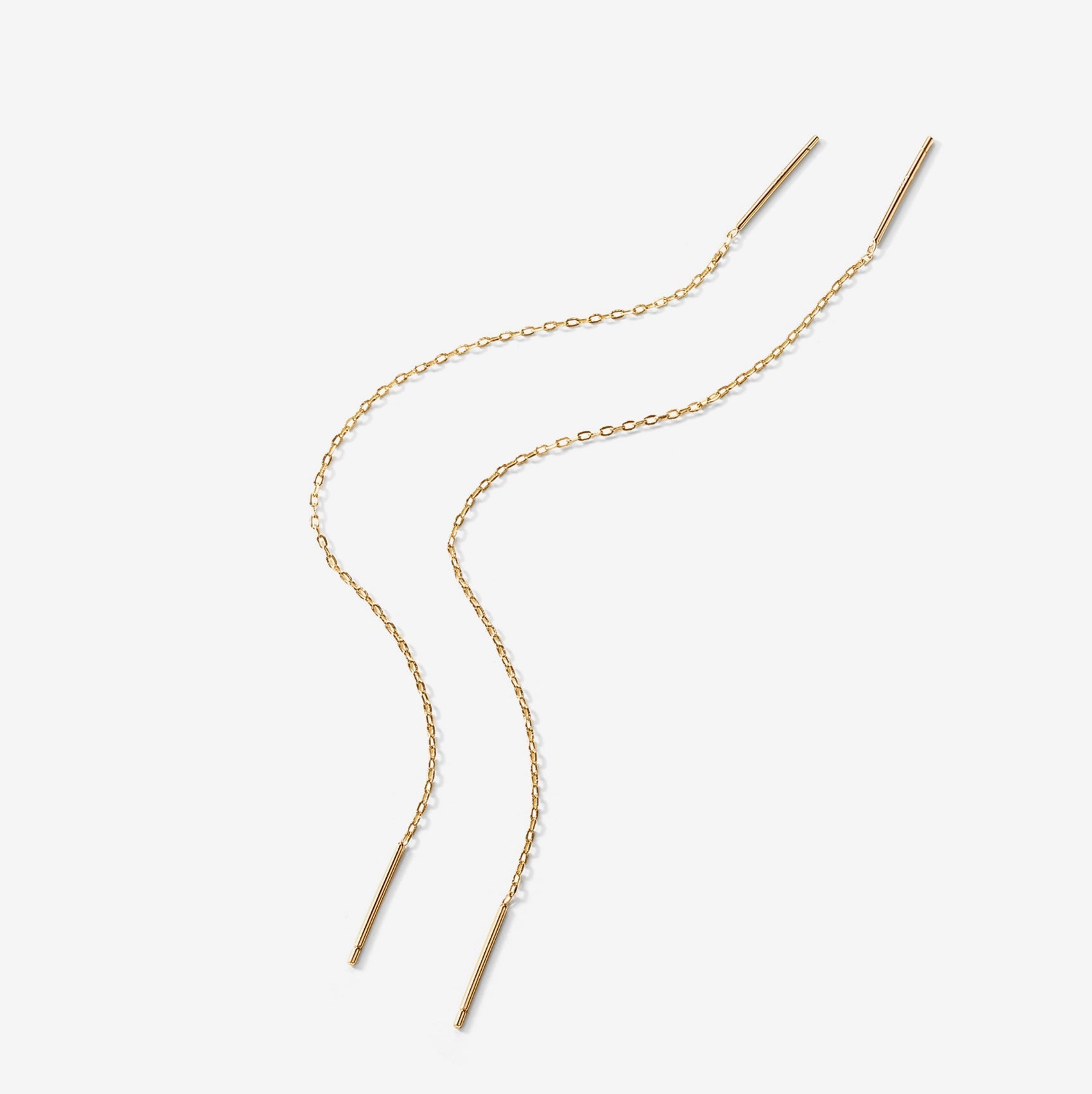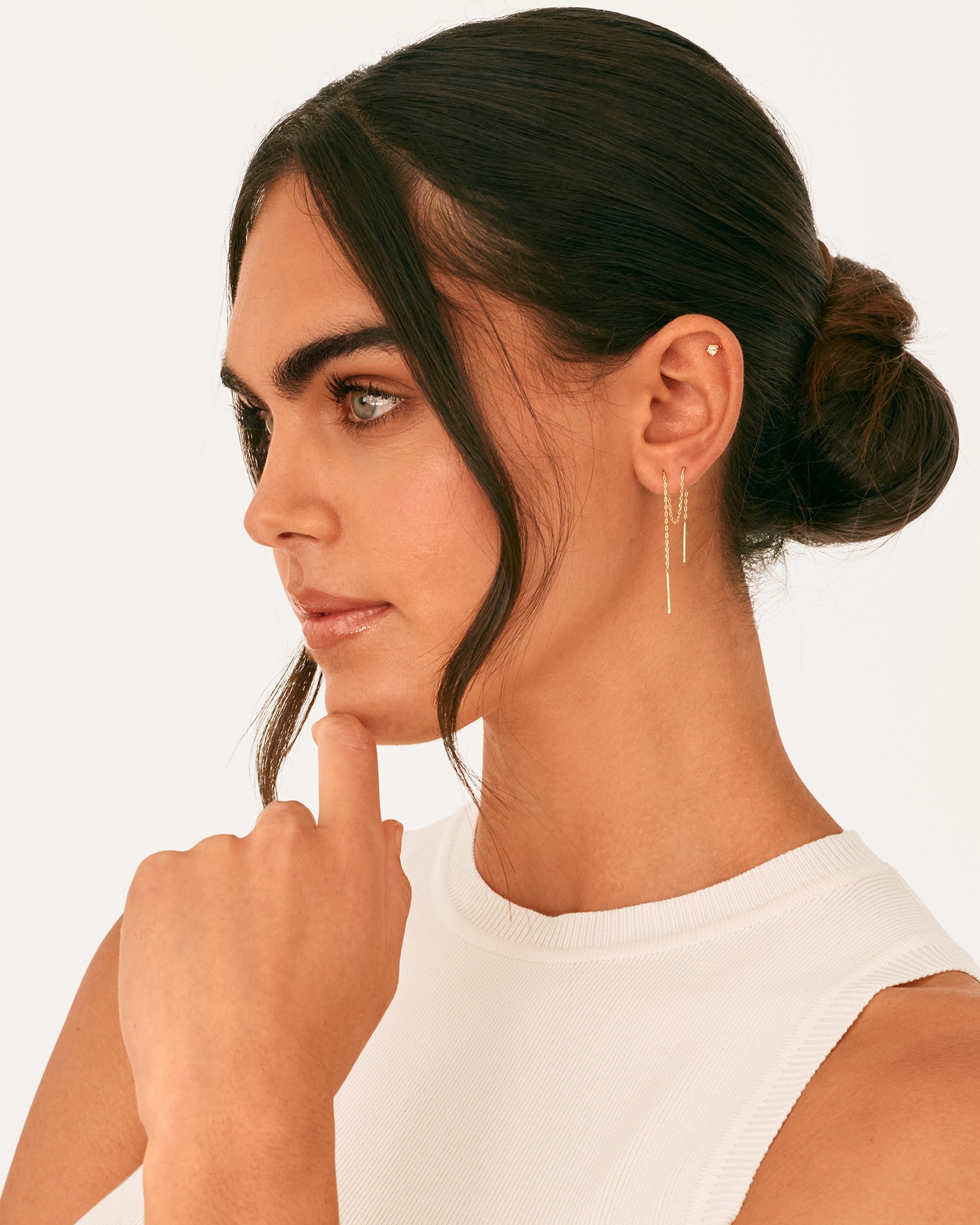 The Celestial Chains Threader Earrings feature delicate chains that gracefully dangle from sleek threader posts, creating a celestial-inspired look. Their elegant design captures the essence of stars and constellations, adding a touch of cosmic charm to any ensemble.