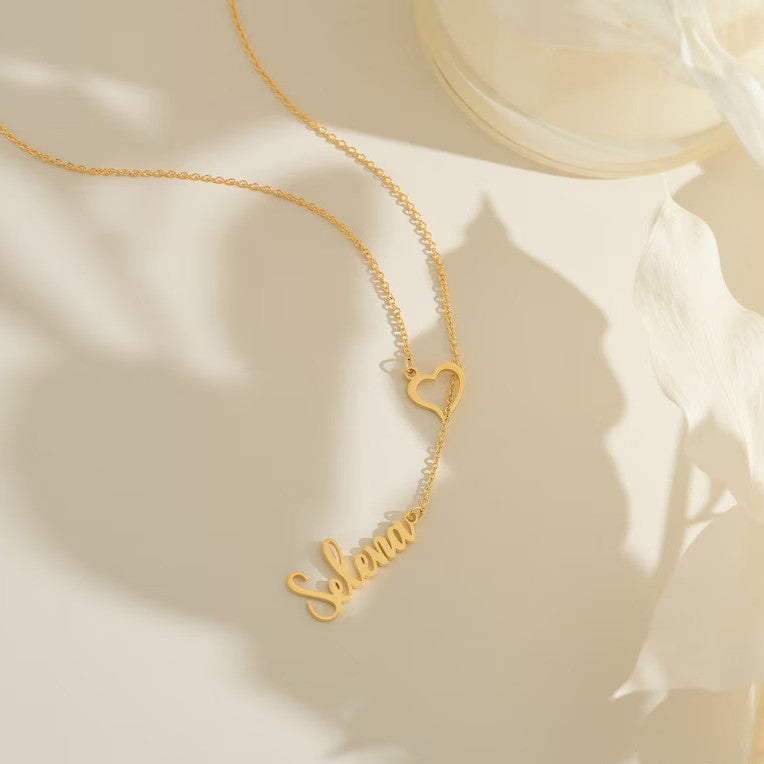 The Custom Heart & Name Lariat Necklace features a stylish and personalized design, with a delicate heart pendant and a custom name engraving. This elegant piece adds a sentimental touch to your jewelry collection, perfect for gifting or adding a unique charm to your everyday look.