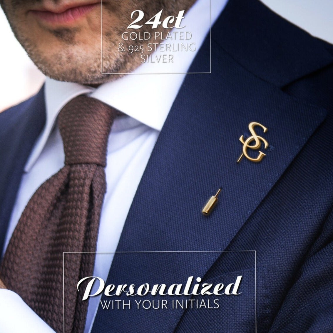 A personalized lapel pin featuring custom initials, designed to add a unique and elegant touch for the groom on his special day. Perfect for weddings, this accessory offers a refined, customized detail to complement the groom's attire.