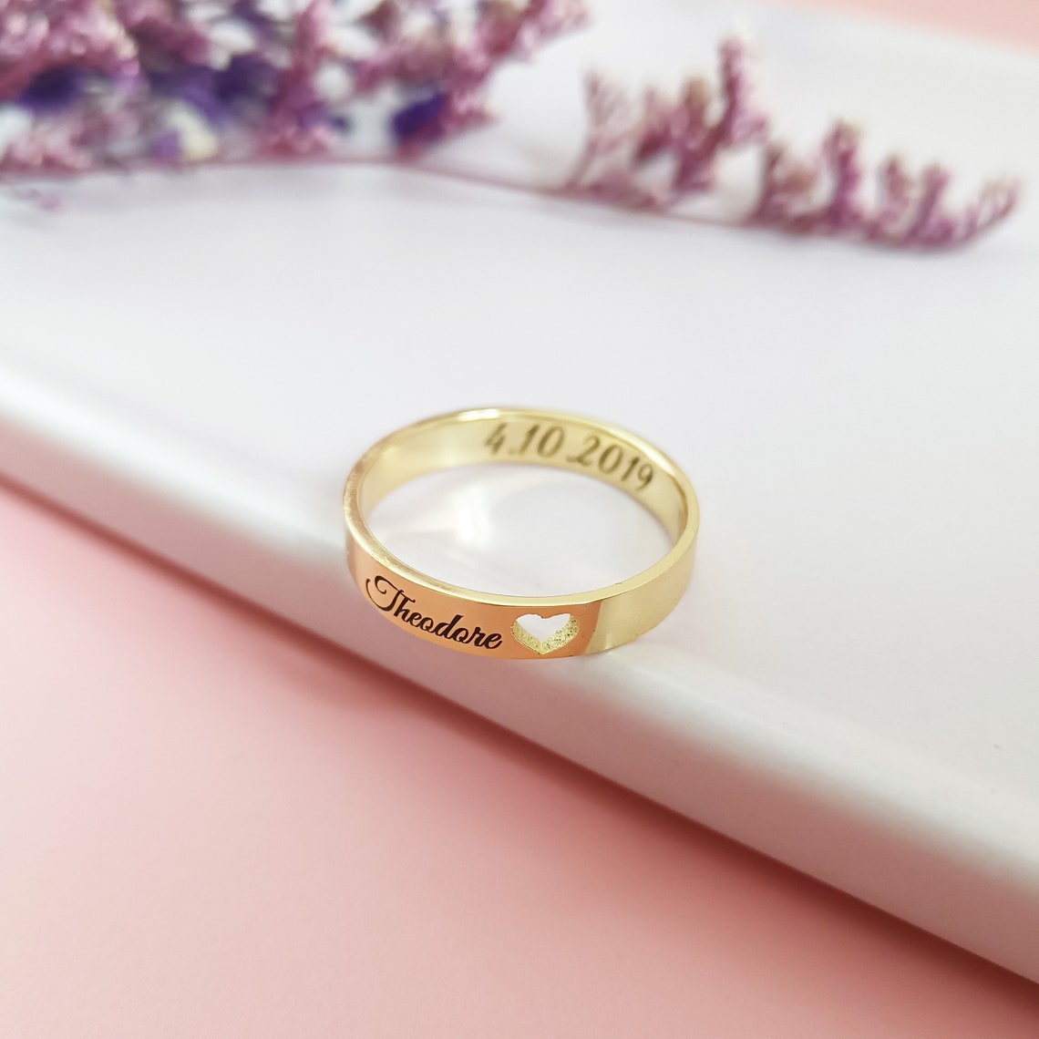 A personalized ring featuring custom engraving on both the inside and outside, making it a unique and meaningful piece. Perfect for gifting or as a personal keepsake, this ring can be customized with names, dates, or special messages.