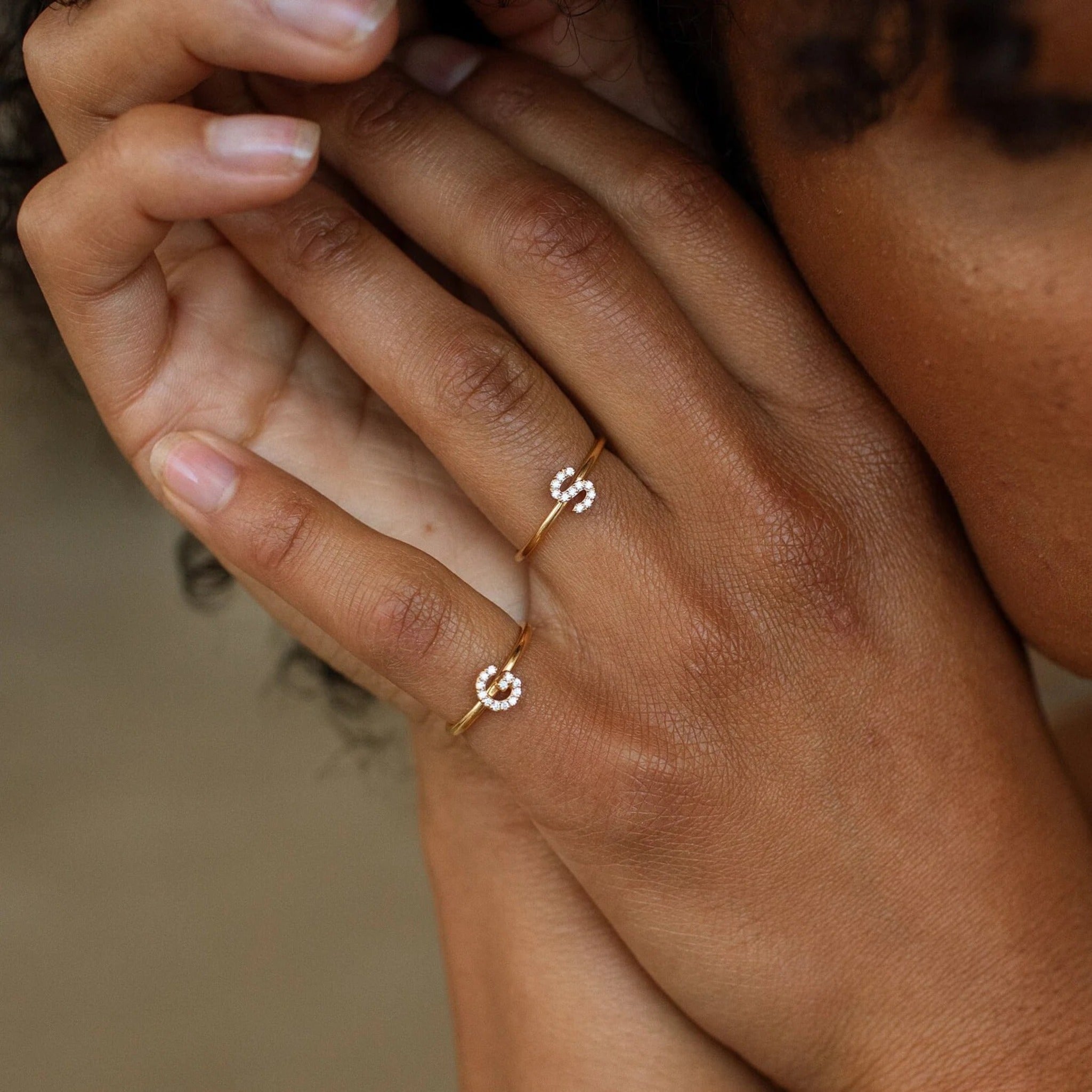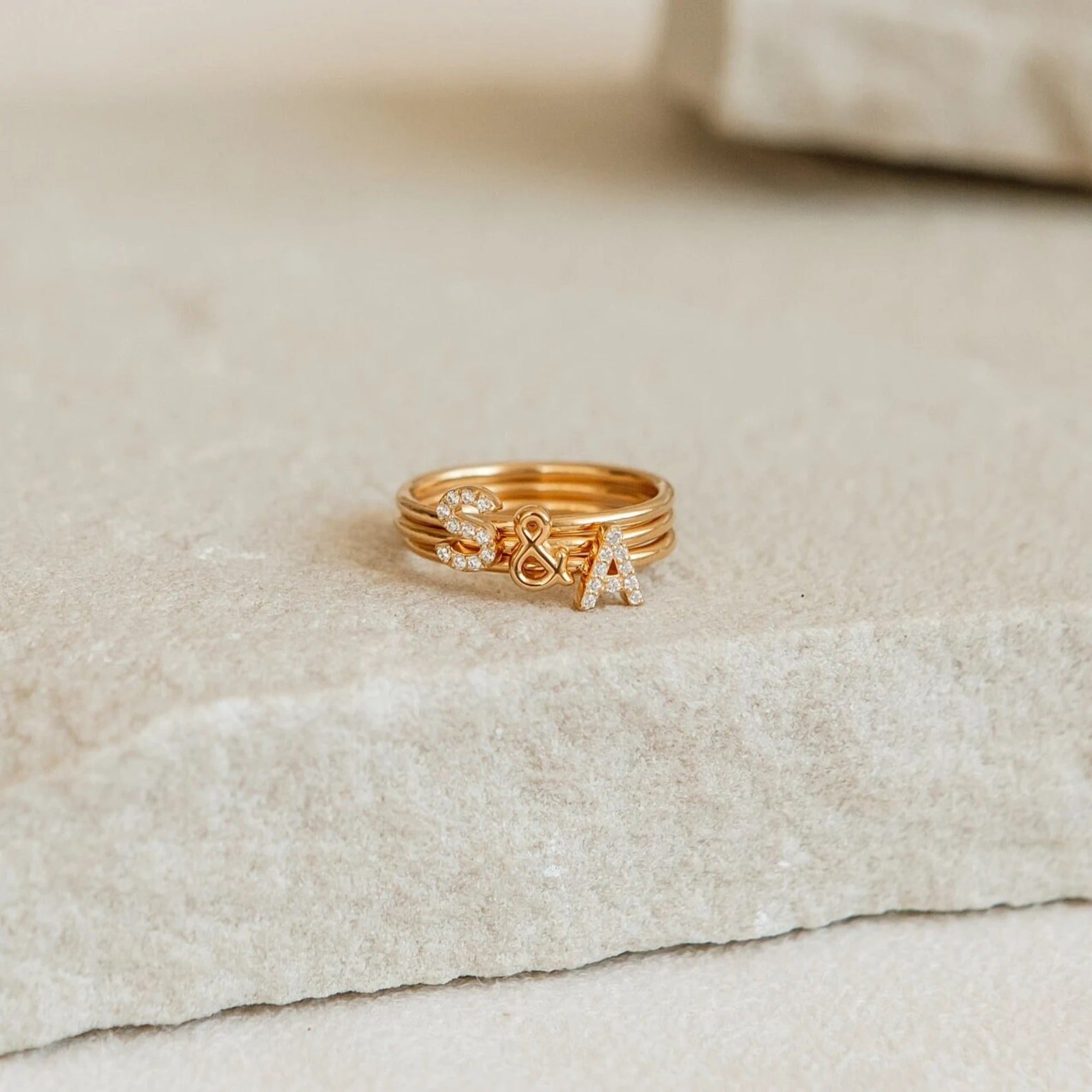 A personalized and stackable ring featuring custom pavé diamonds, perfect for adding a touch of elegance and individuality to your jewelry collection. Ideal for showcasing initials or meaningful letters in a minimalist design.