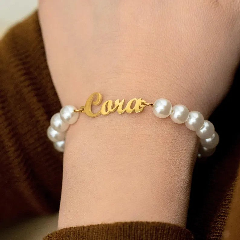 The Custom Pearl Name Bracelet is a beautiful blend of elegance and personalization. Featuring lustrous pearls and a custom-engraved name or word, this bracelet offers a unique and meaningful touch to any outfit. Perfect for gifting or adding a personal flair to your jewelry collection.