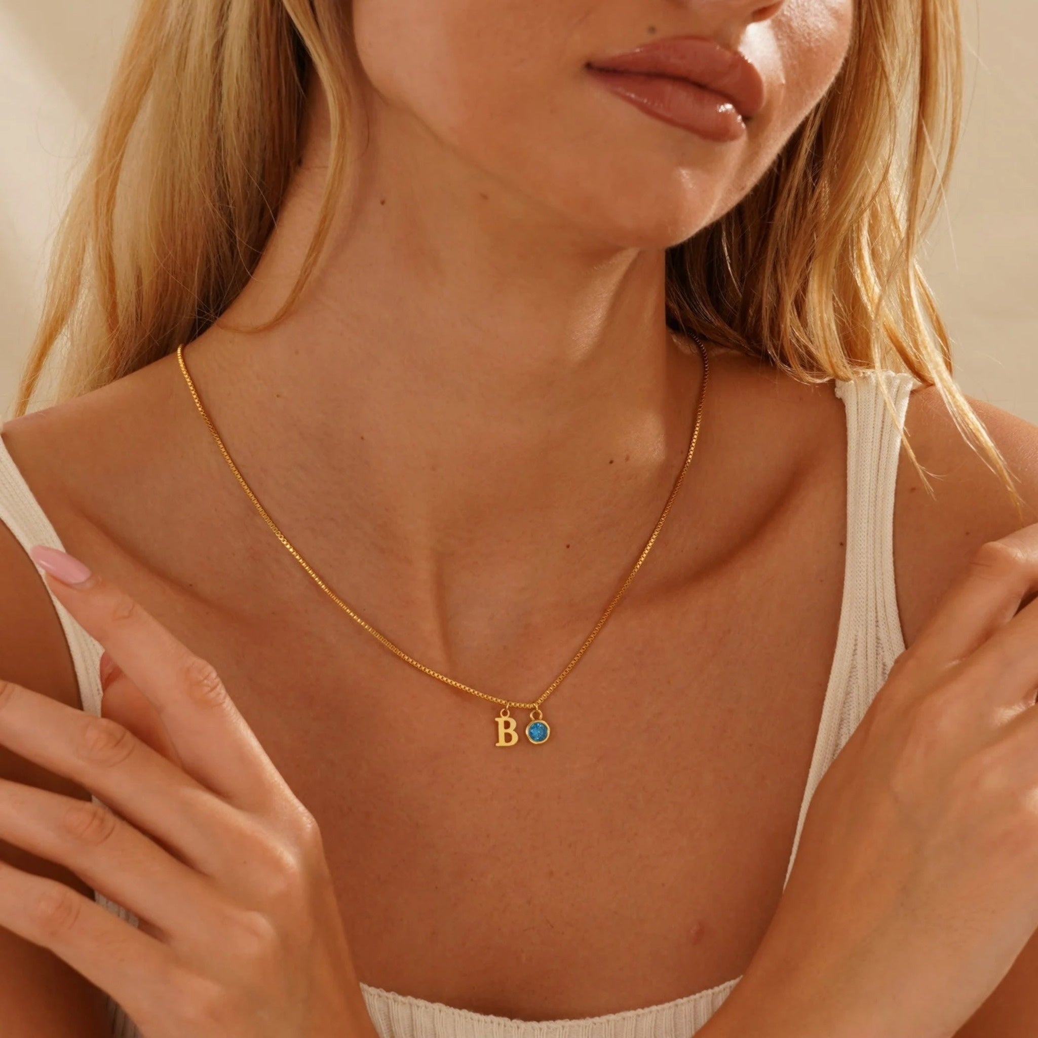The Dainty Initial Birthstone Necklace with Box Chain features a delicate design with a personalized initial and birthstone, strung on a sleek box chain. It's a simple yet meaningful accessory, perfect for everyday wear or as a thoughtful gift.
