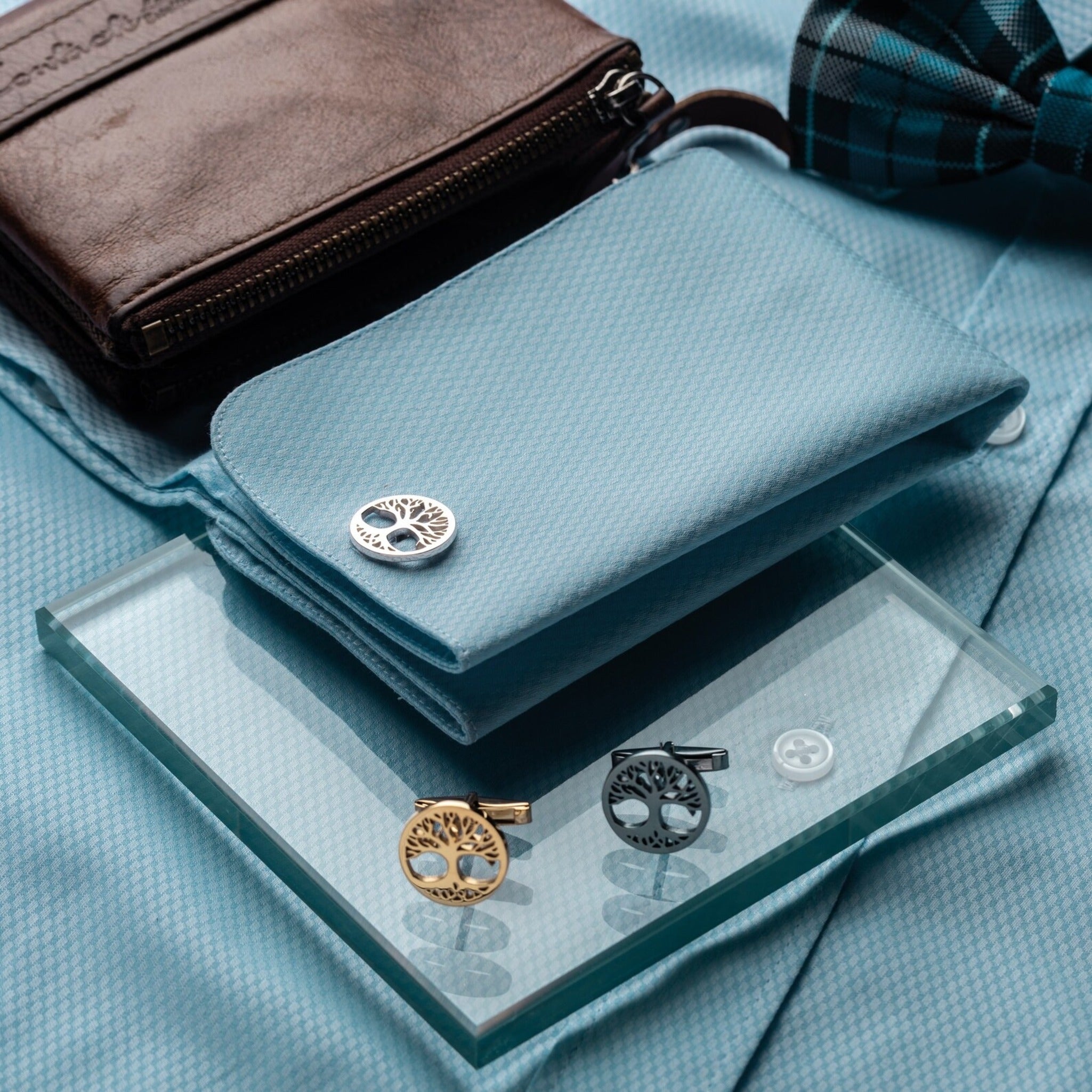 This exquisite pair of Gold 'Tree of Life' Cufflinks is a stunning accessory that symbolizes growth, connection, and family heritage. More than just a piece of jewelry, these cufflinks are a wearable piece of art, offering a unique blend of symbolic meaning and sophisticated style perfect for formal events, weddings, or as a thoughtful gift. The intricate cut-out design provides visual depth, making these a standout addition to any shirt cuff.