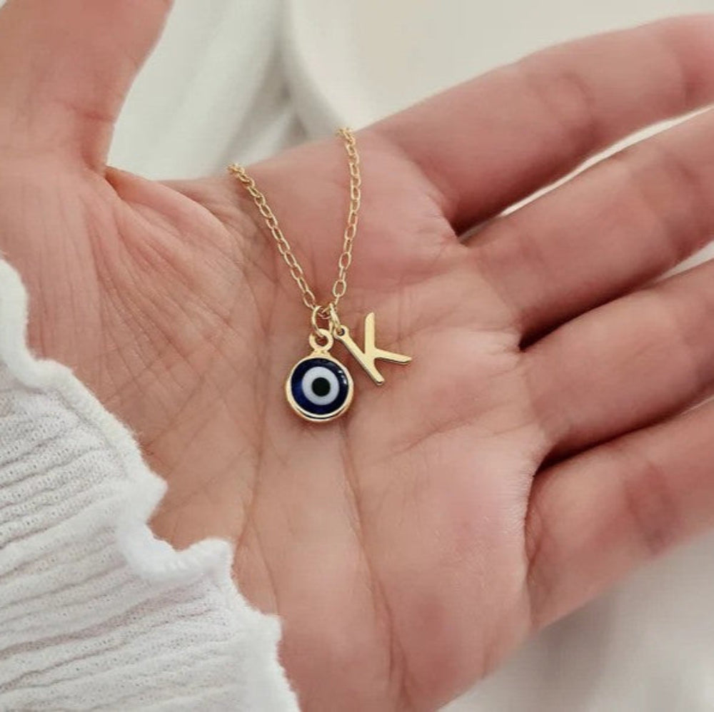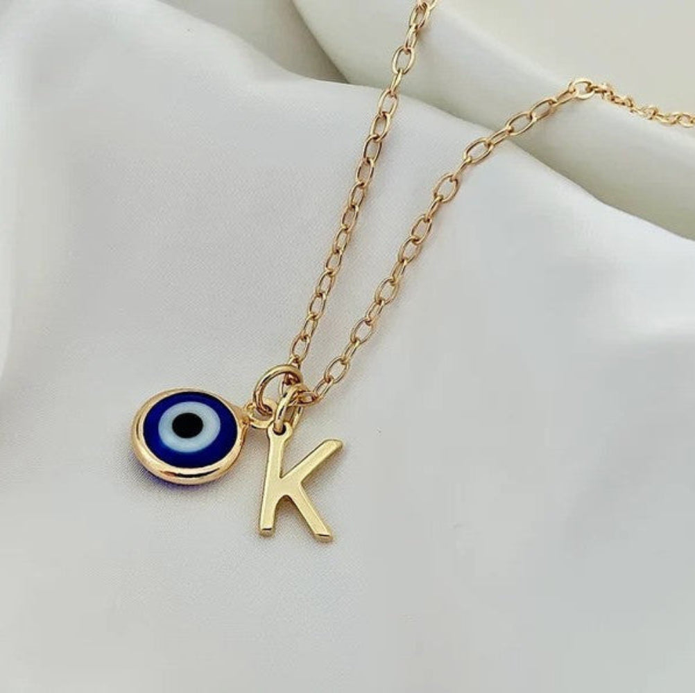The Evil Eye Initial Letter Necklace features a delicate design combining a protective evil eye charm with a personalized initial letter pendant. The evil eye is believed to ward off negativity, while the initial adds a unique, personal touch. This necklace is perfect for everyday wear or as a thoughtful gift, blending style and meaningful symbolism.