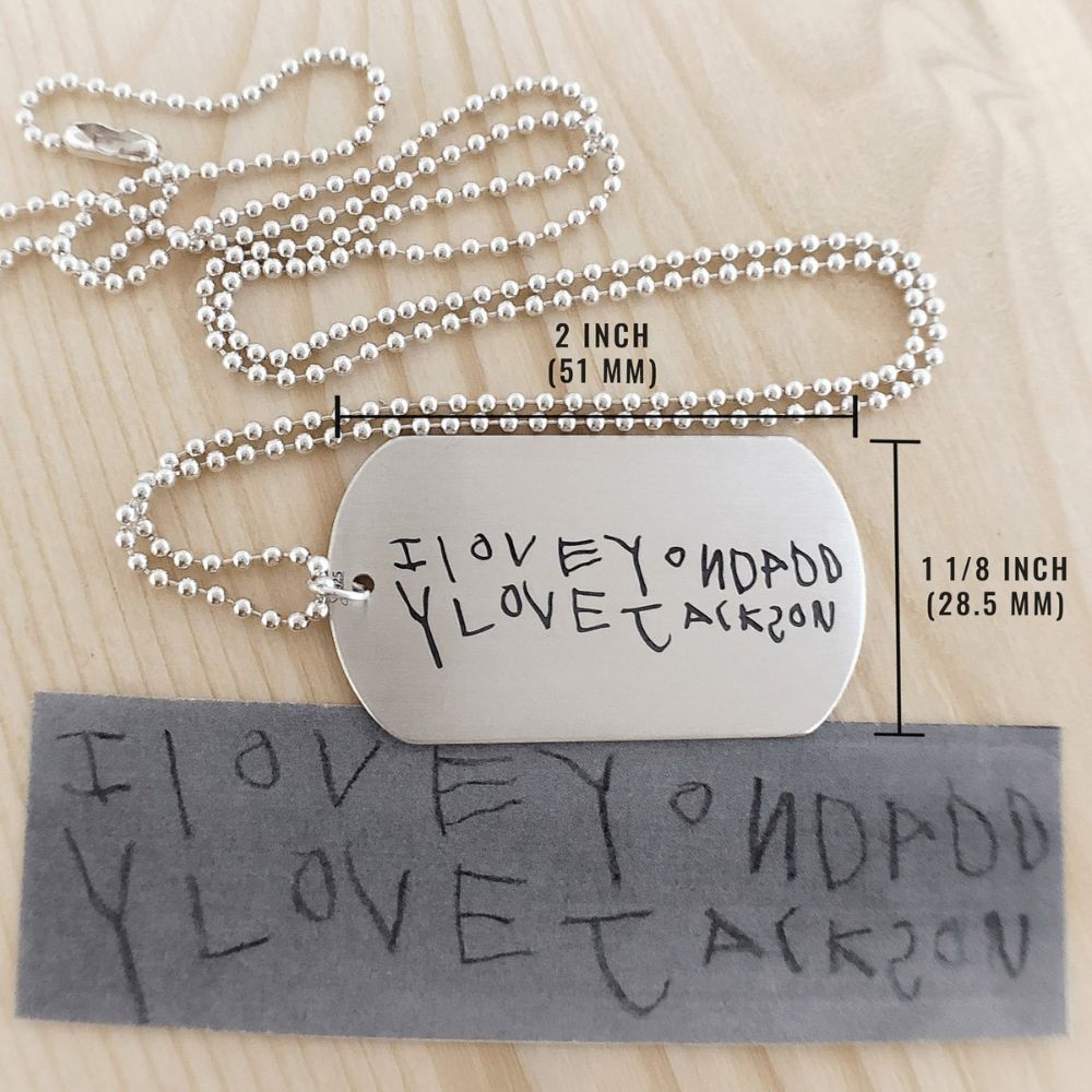 The Custom Handwriting Tag Necklace is a personalized piece of jewelry that features a pendant engraved with a loved one's handwriting or a meaningful message, making it a unique and sentimental keepsake. Perfect for gifting or cherishing special memories.