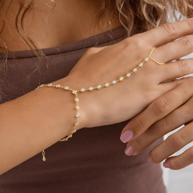 The Hand Chain Finger-Ring Bracelet is a trendy and elegant accessory that combines a finger ring and a delicate hand chain. Perfect for adding a touch of boho chic, this unique piece enhances your look with its stylish design while allowing freedom of movement. A beautiful fusion of jewelry and functionality!