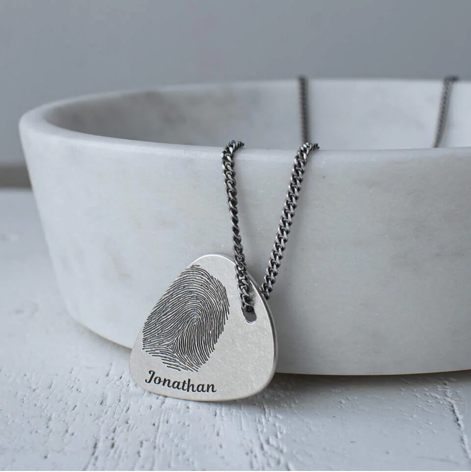 A Personalized Fingerprint Plectrum Necklace is a unique and sentimental accessory that captures the intricate details of your loved one's fingerprint. Crafted with precision, this custom-made plectrum pendant is perfect for music lovers and serves as a heartfelt keepsake, blending personal memories with timeless design. Ideal for special occasions like anniversaries, birthdays, or as a meaningful gift.