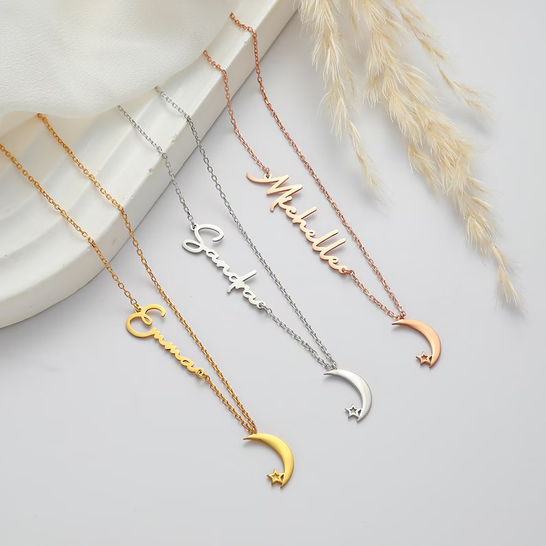 The Personalized Name with Crescent Moon Necklace combines elegance and meaning, featuring a custom name pendant paired with a delicate crescent moon design. This beautiful and unique piece makes a thoughtful gift for loved ones or a stunning addition to your jewelry collection.