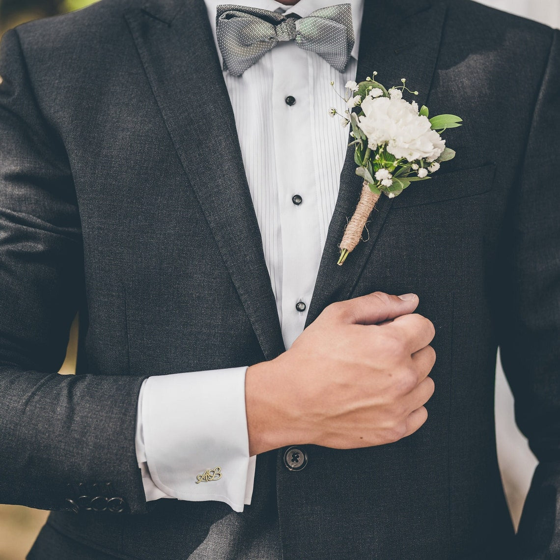A stylish and personalized pair of cufflinks featuring custom initials in a heart design. Perfect for adding a unique and sentimental touch to formal attire, these cufflinks make a thoughtful gift for special occasions like weddings, anniversaries, or personal milestones.