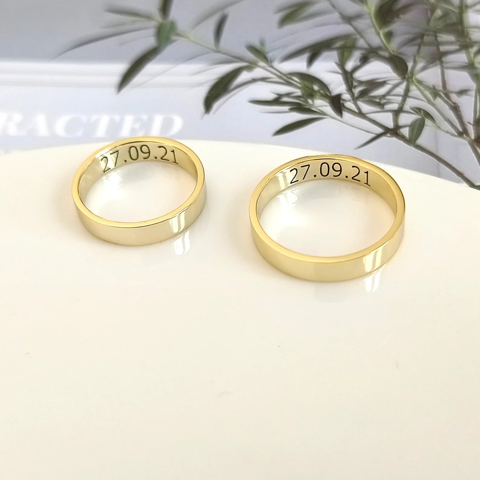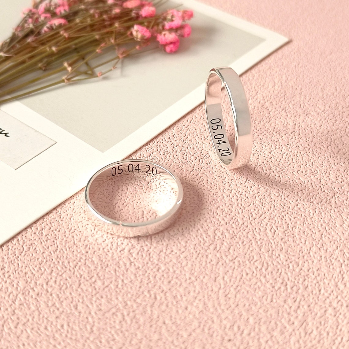 A stylish and meaningful Couple Ring Set, featuring personalized text engraving for each partner. Perfect for love birds, these rings symbolize a deep connection and make a unique, thoughtful gift for any special occasion.