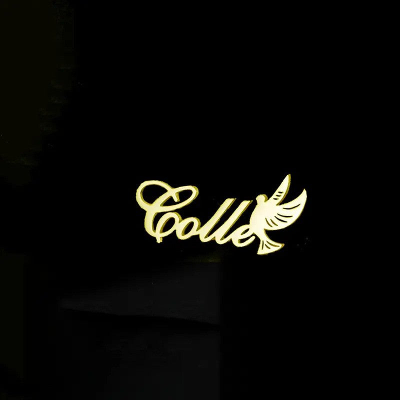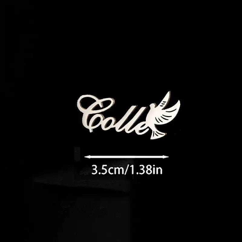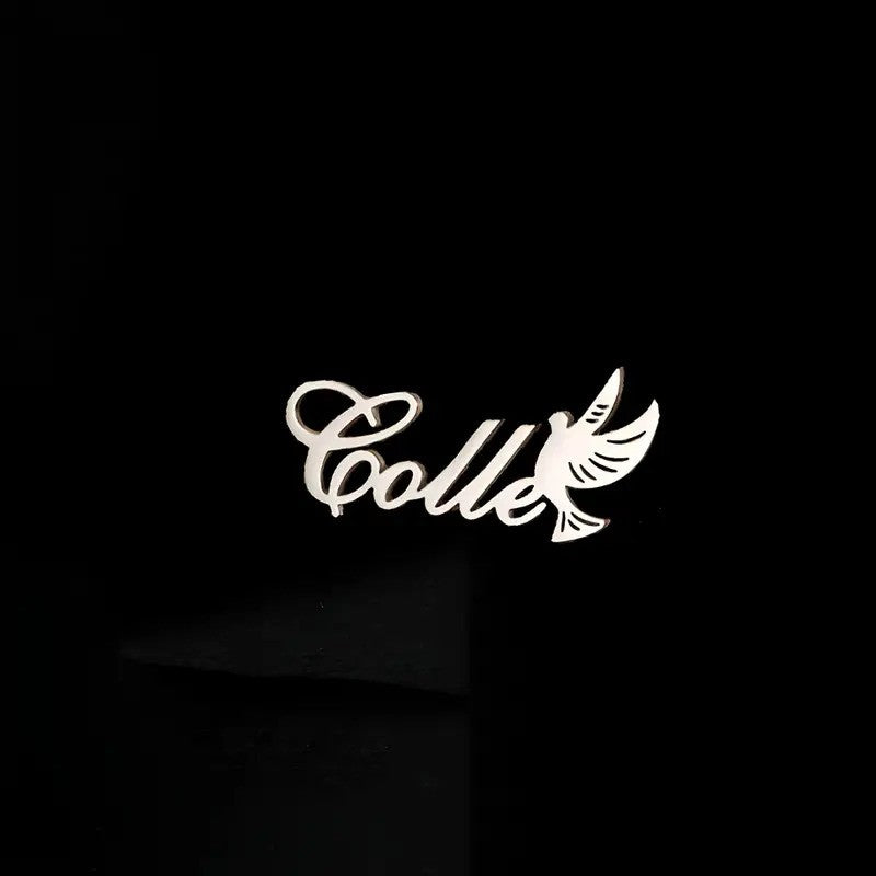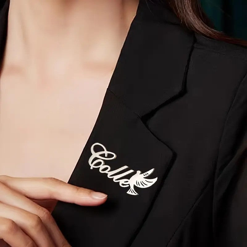 A beautifully crafted personalized dove name brooch, featuring a graceful dove in flight. This elegant piece is customized with a name, adding a meaningful and unique touch. Perfect for symbolizing peace and love, it’s a sophisticated accessory to elevate any look with a personal flair.