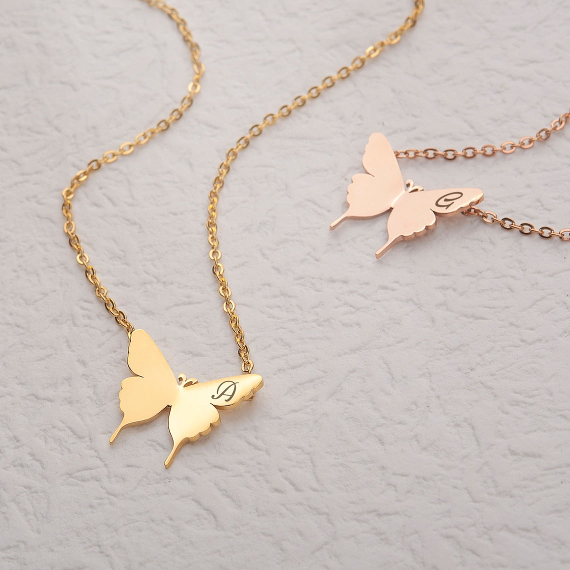 The Personalized Engraved Initial Letter Butterfly Necklace features a delicate butterfly charm with a customizable initial engraving. This elegant piece blends nature-inspired beauty with a personal touch, making it a thoughtful and meaningful gift. Perfect for any occasion, it adds a touch of grace and individuality to any outfit.