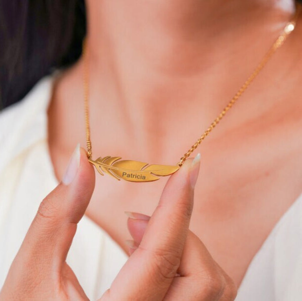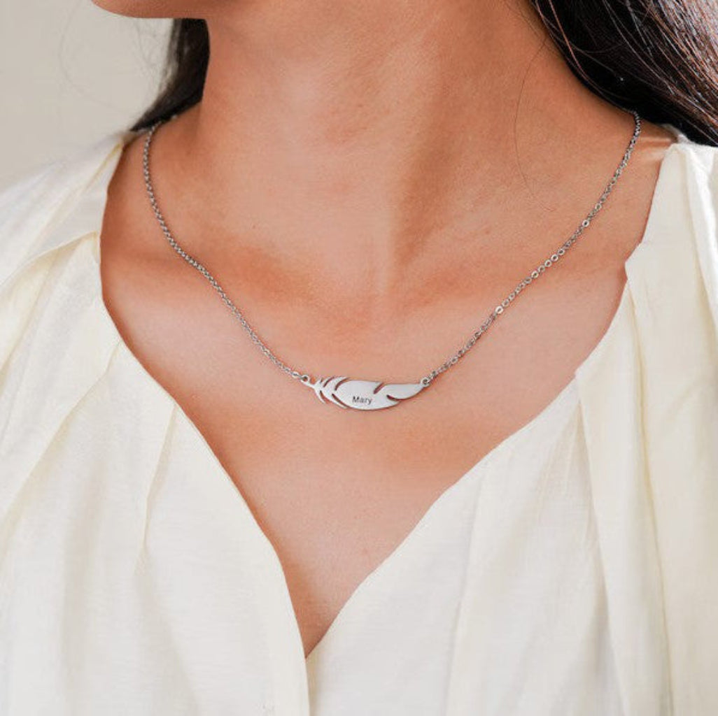 The Personalized Feather Necklace features a delicate feather pendant, customizable with a name, initial, or meaningful engraving. This elegant and versatile piece adds a personal touch to any outfit, making it a perfect gift or a stylish accessory for yourself.