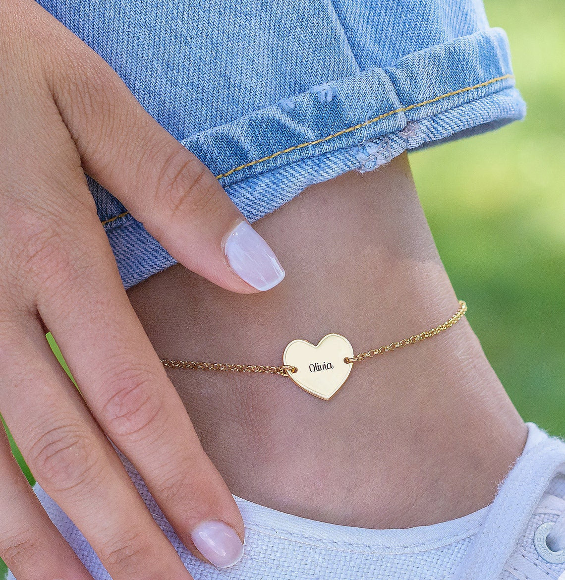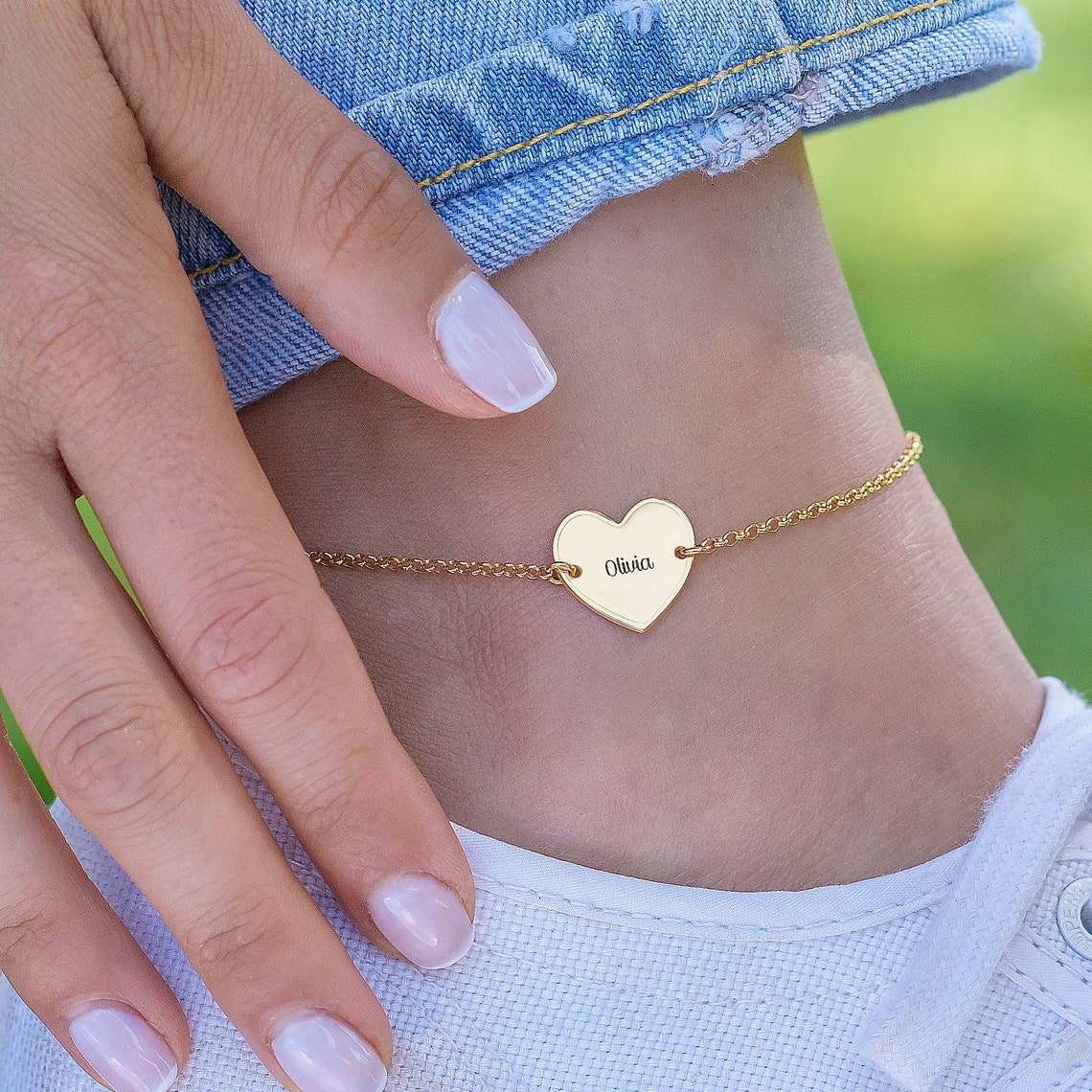 This Personalized Engraved Heart Charm Name Anklet features a delicate heart charm custom engraved with a name, adding a personal touch to a stylish piece of jewelry. Perfect for gifting or as a meaningful accessory, this anklet combines elegance with sentiment.