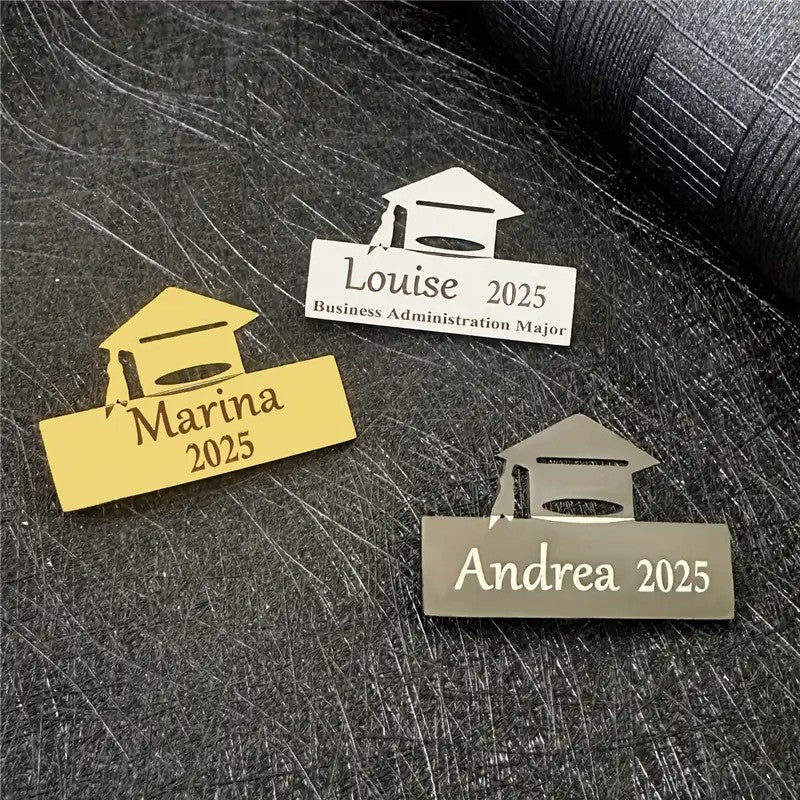 A personalized graduation brooch is a custom-designed accessory, typically featuring the graduate's name, graduation year, or a special symbol, to commemorate their achievement. It is often worn on graduation attire or displayed as a keepsake to celebrate the milestone. The brooch can be crafted in various styles, from elegant and simple to more intricate designs, making it a thoughtful and meaningful gift.