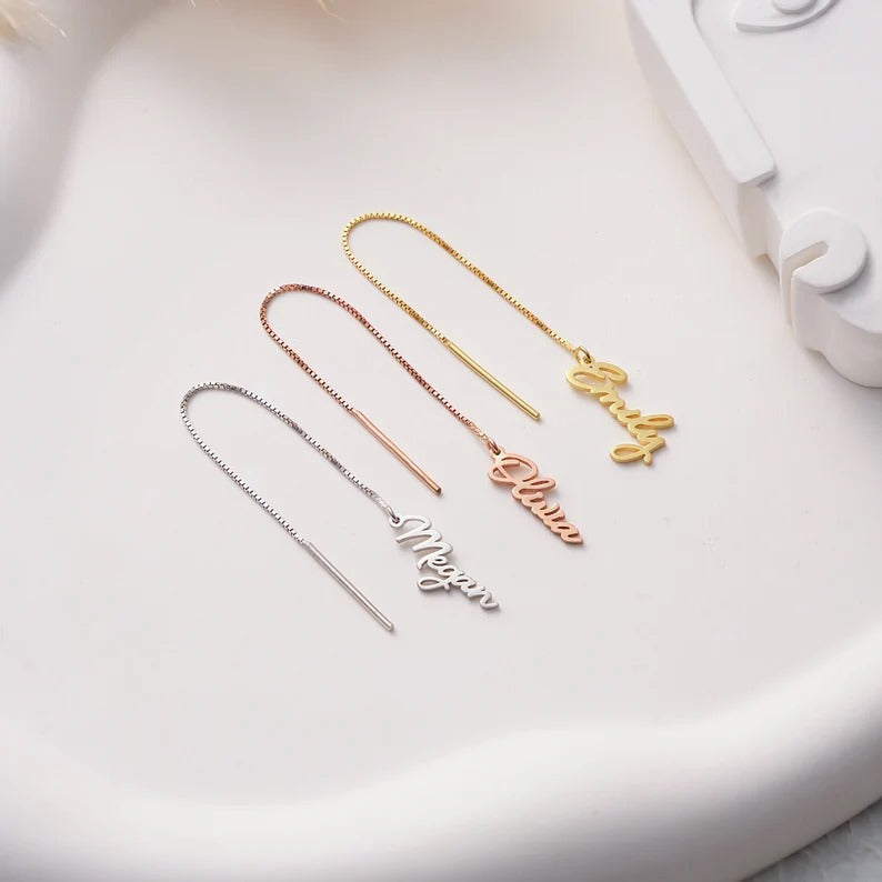 These Personalized Name Dangle Earrings feature custom-crafted pendants with your name or initials, elegantly hanging from delicate chains. A perfect accessory for adding a unique, stylish touch to any outfit.