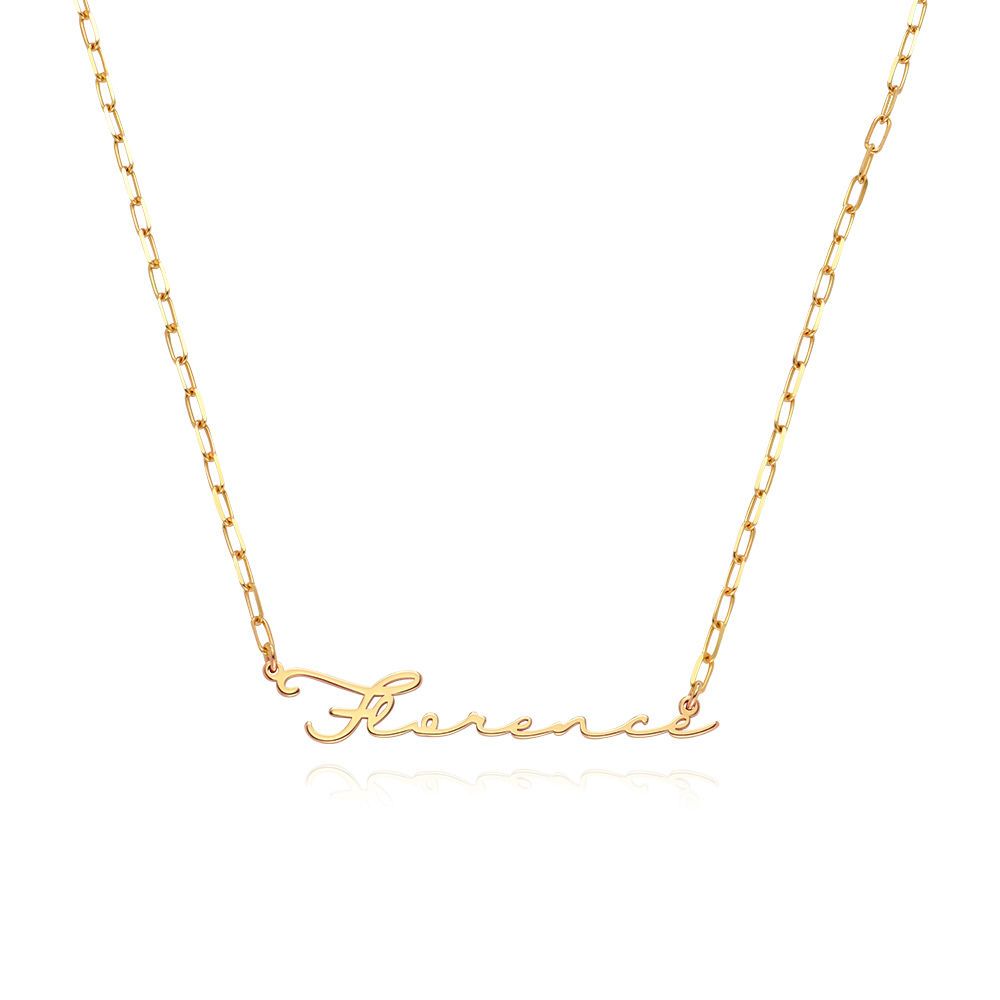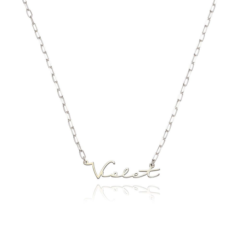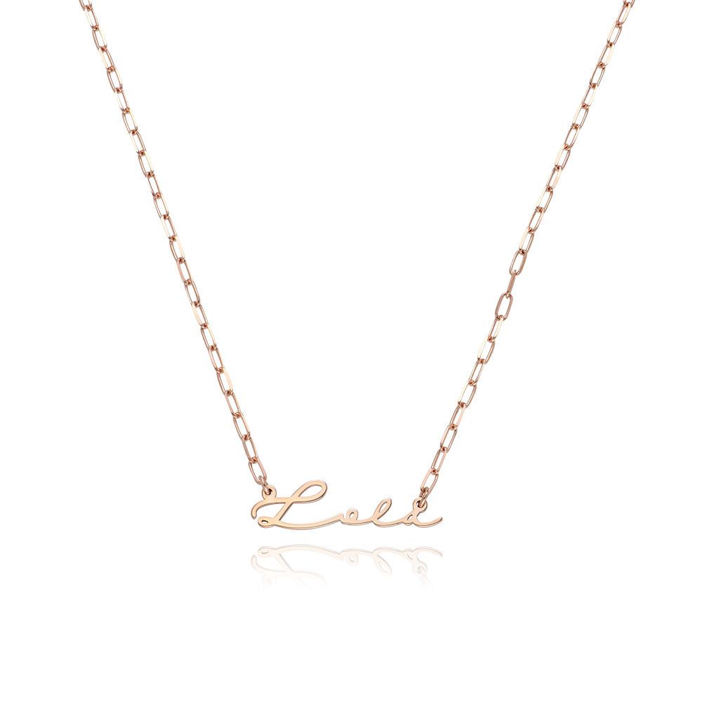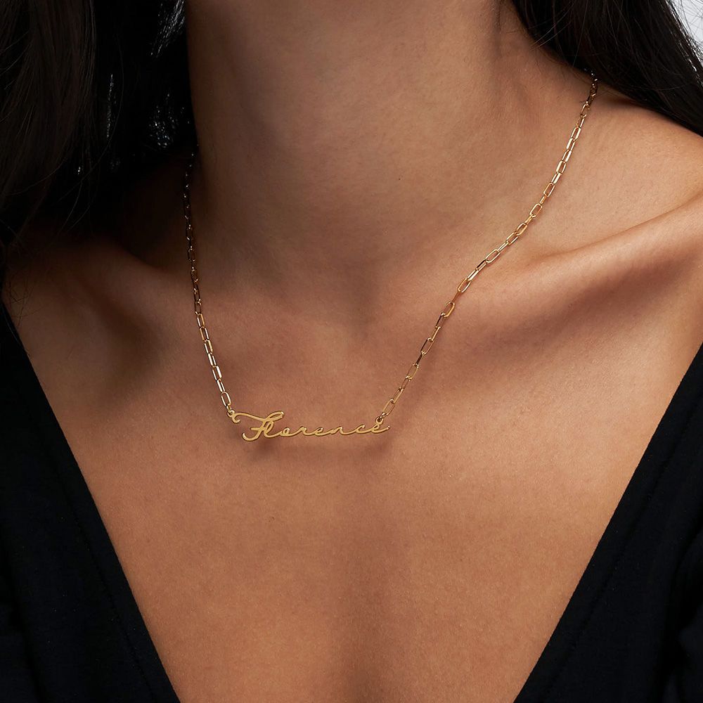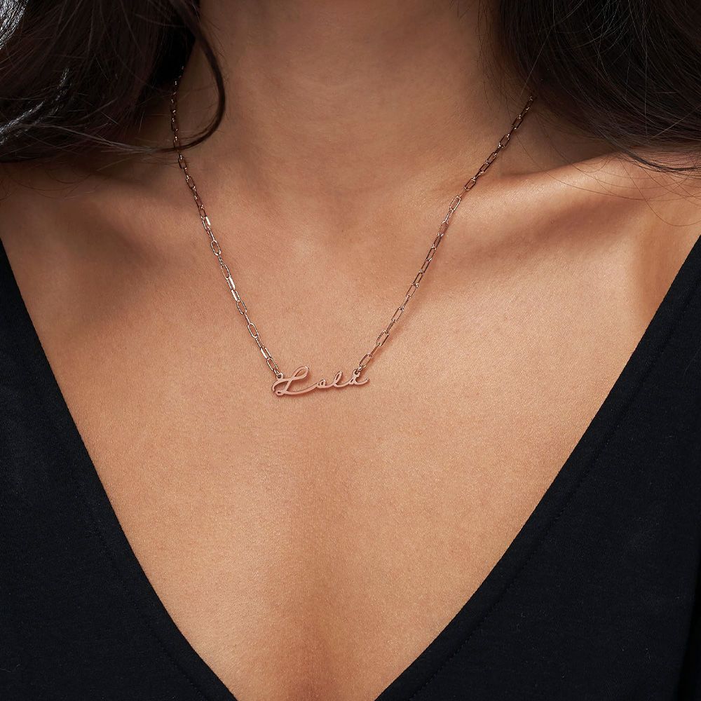 The Personalized Signature Style Link Chain Name Necklace features a sleek, modern design with your name or a special word crafted in a stylish signature font. The elegant link chain complements the custom name pendant, creating a unique and meaningful accessory. Perfect for adding a personal touch to any outfit or as a thoughtful gift, this necklace offers a timeless way to showcase your individuality.