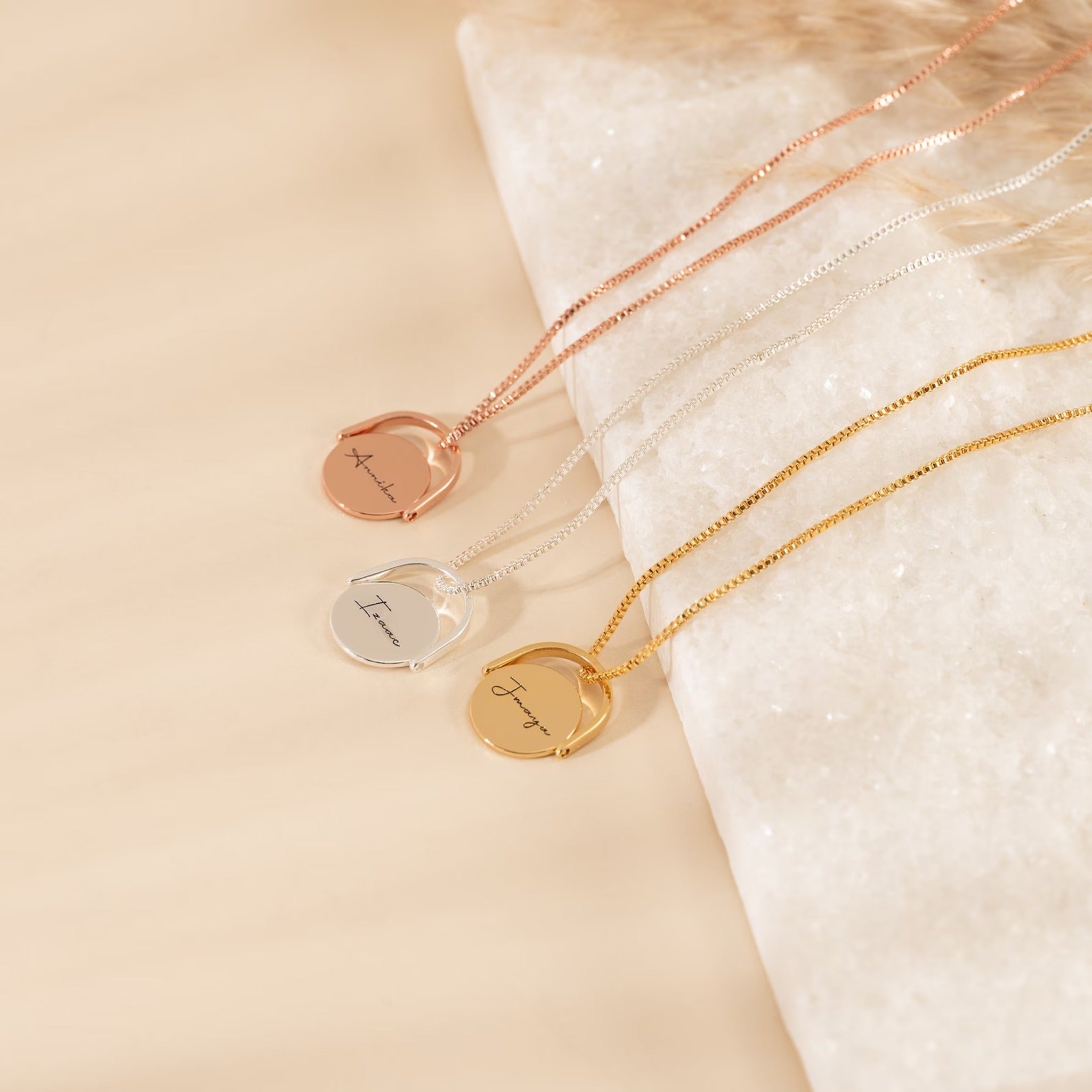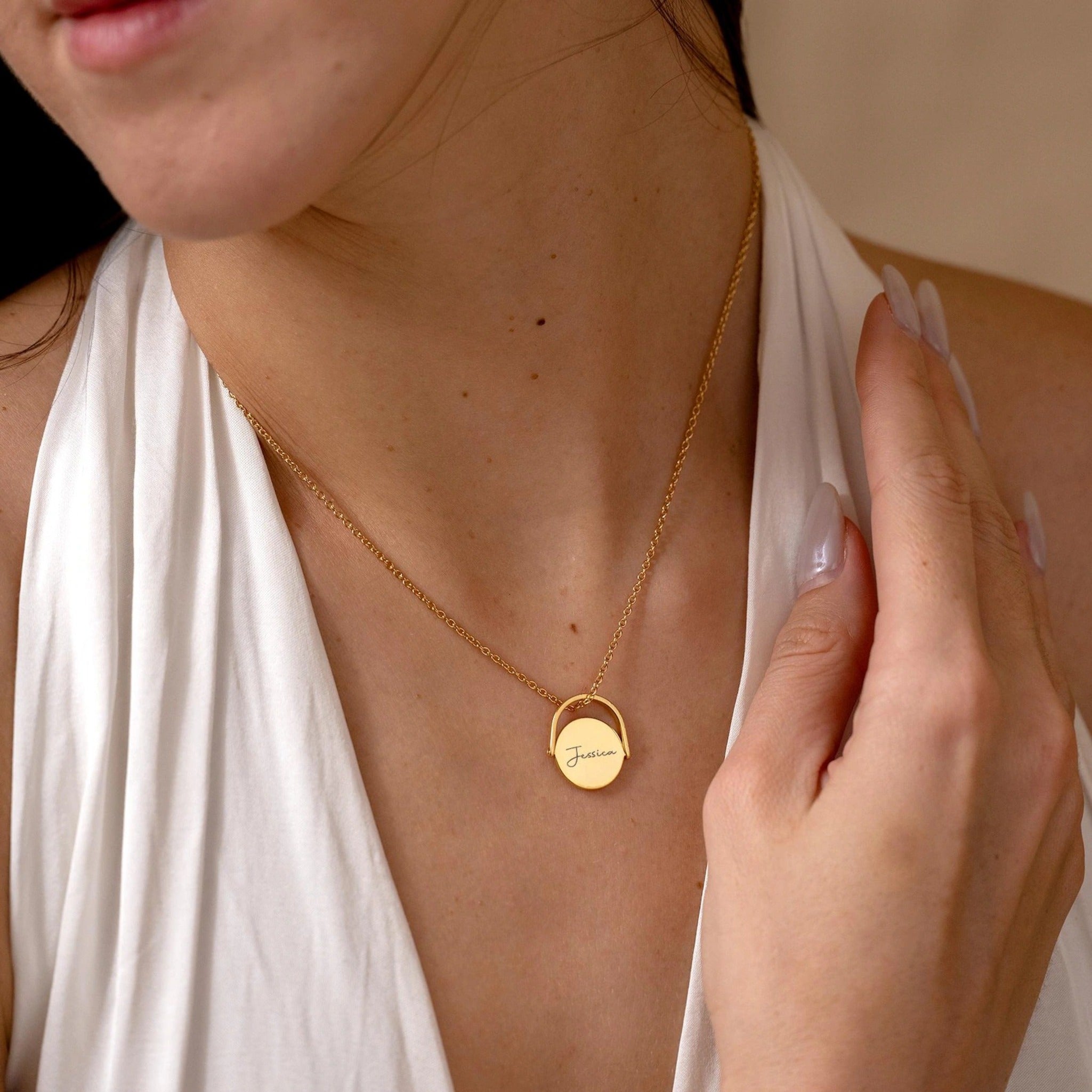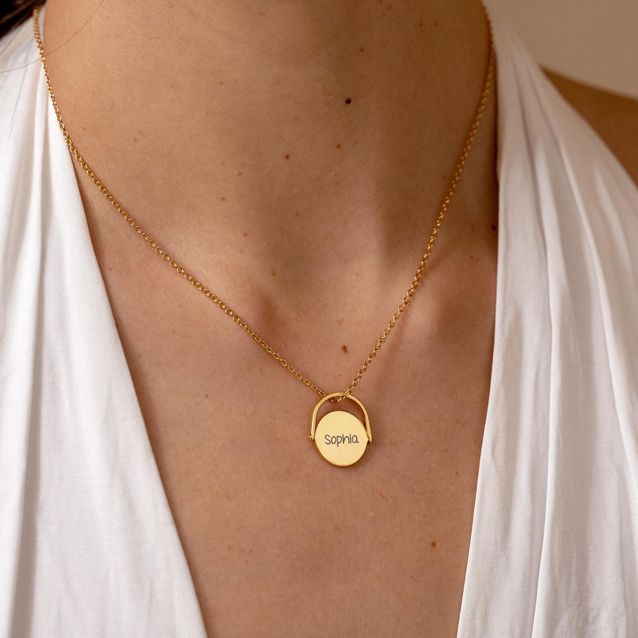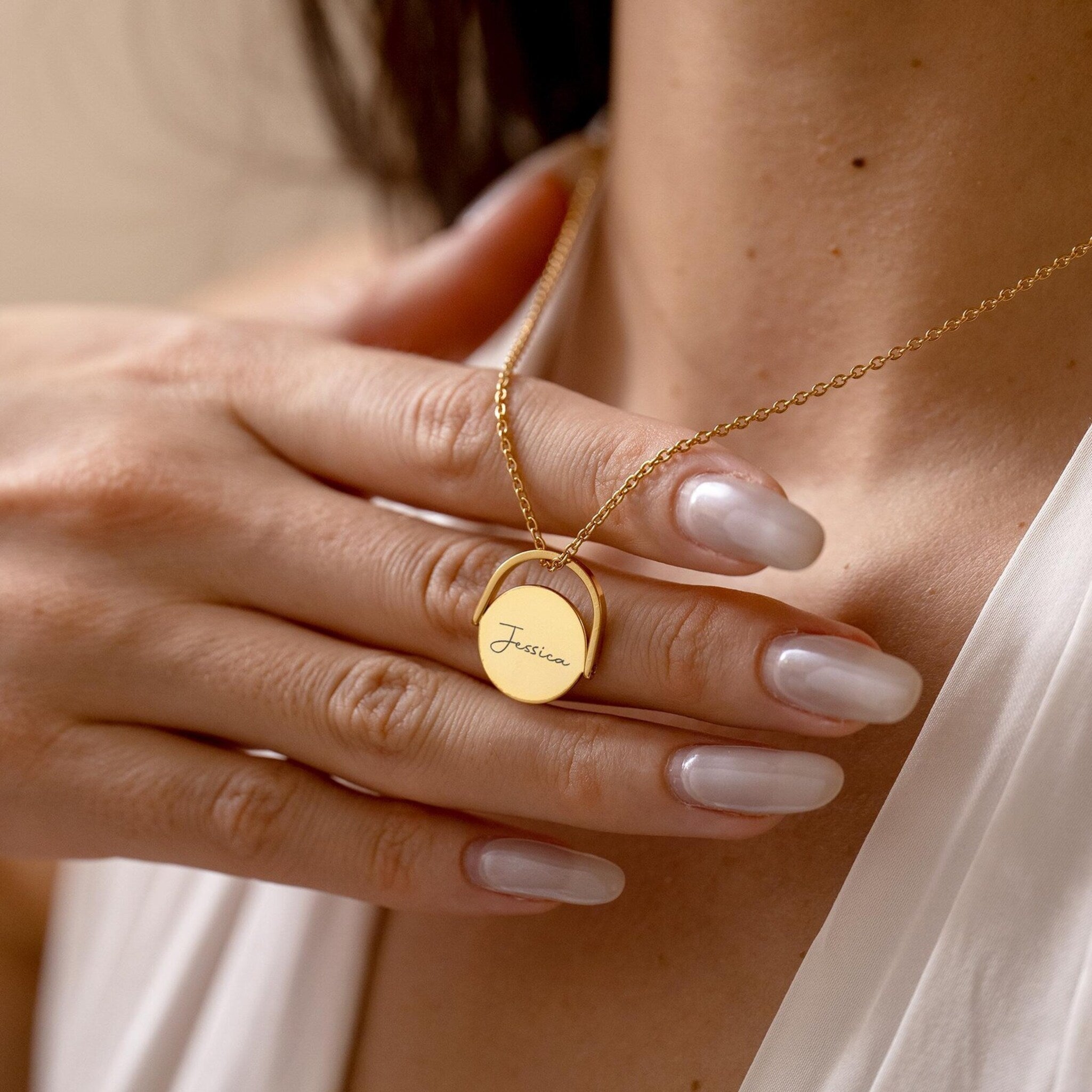 The Personalized Spinner Name Necklace features a unique design with a spinning pendant, engraved with your name or initials. It's a stylish and customizable piece, perfect for adding a personal touch to your jewelry collection.
