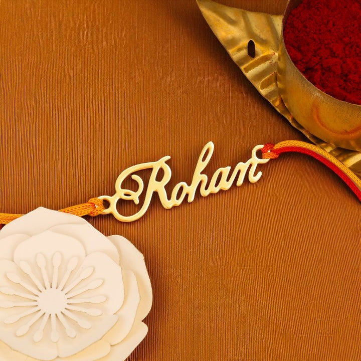 This Raksha Bandhan, tie a thread that speaks his name — literally. Our Personalized Custom Name Rakhi, handcrafted in signature calligraphy style, is a blend of tradition, love, and timeless elegance. Featuring your brother’s name in an elegant script and finished in 18K Gold Plating, it’s more than a rakhi — it’s a heartfelt keepsake.