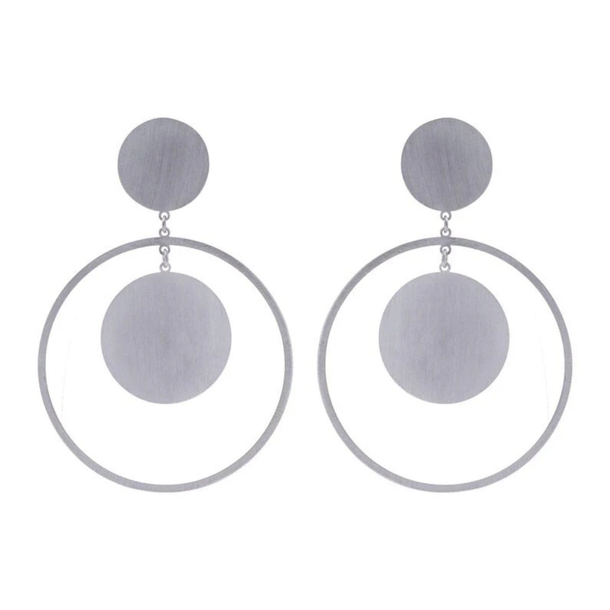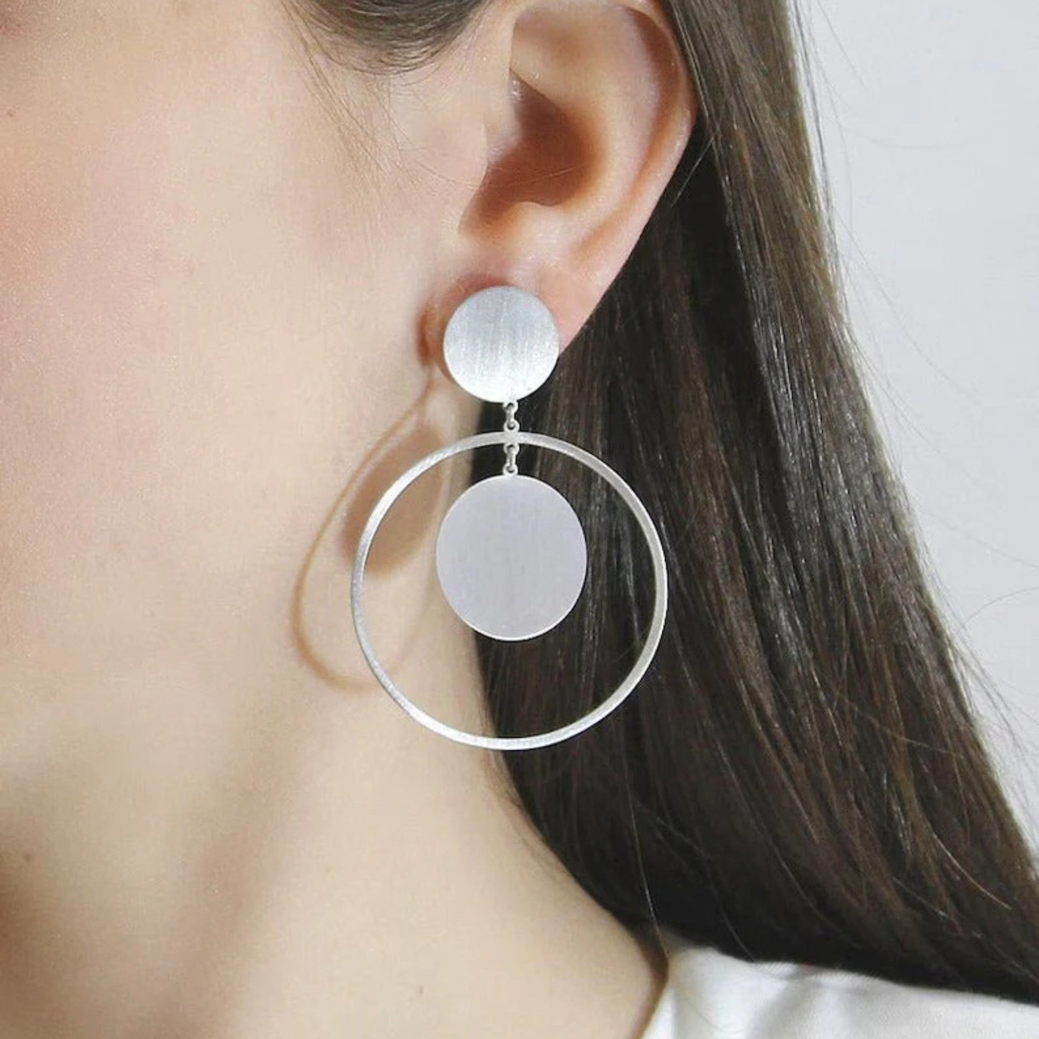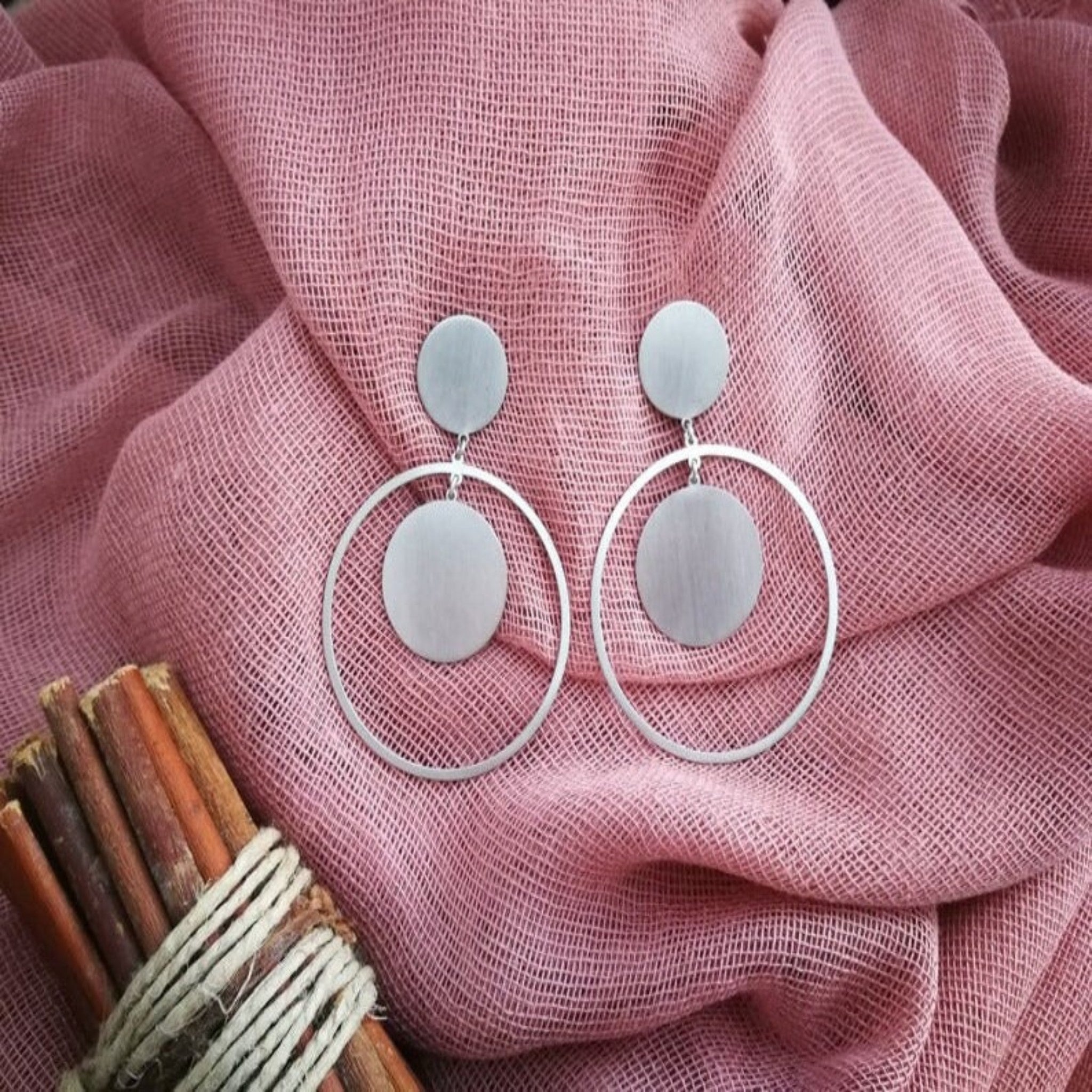 Make a bold statement with these modern geometric earrings, crafted for the stylish woman who loves minimalist design with a twist. Featuring a sleek matte silver finish, the design includes a large open circle paired with a floating disc — elegant, edgy, and effortlessly chic. ⚪💫