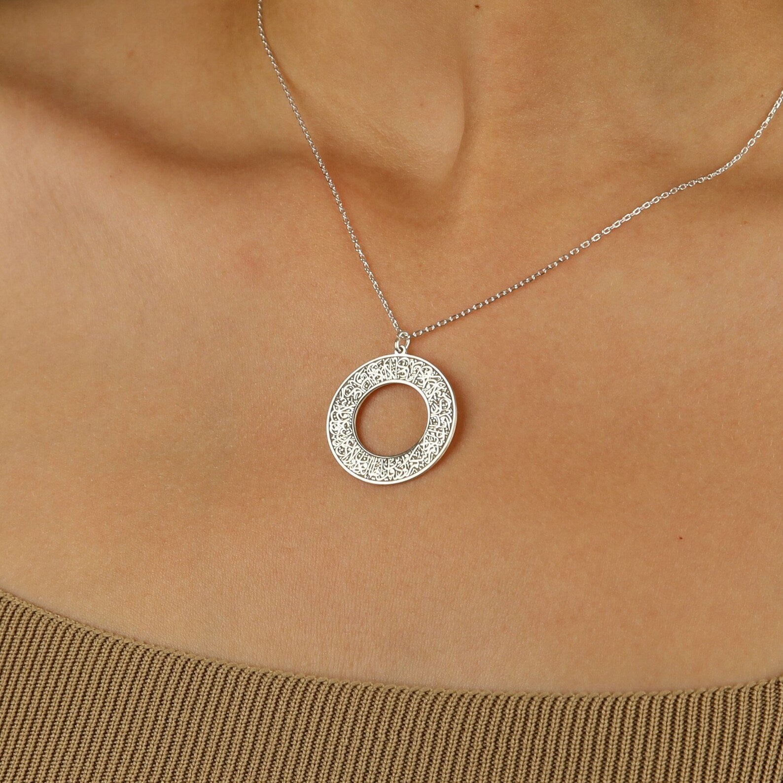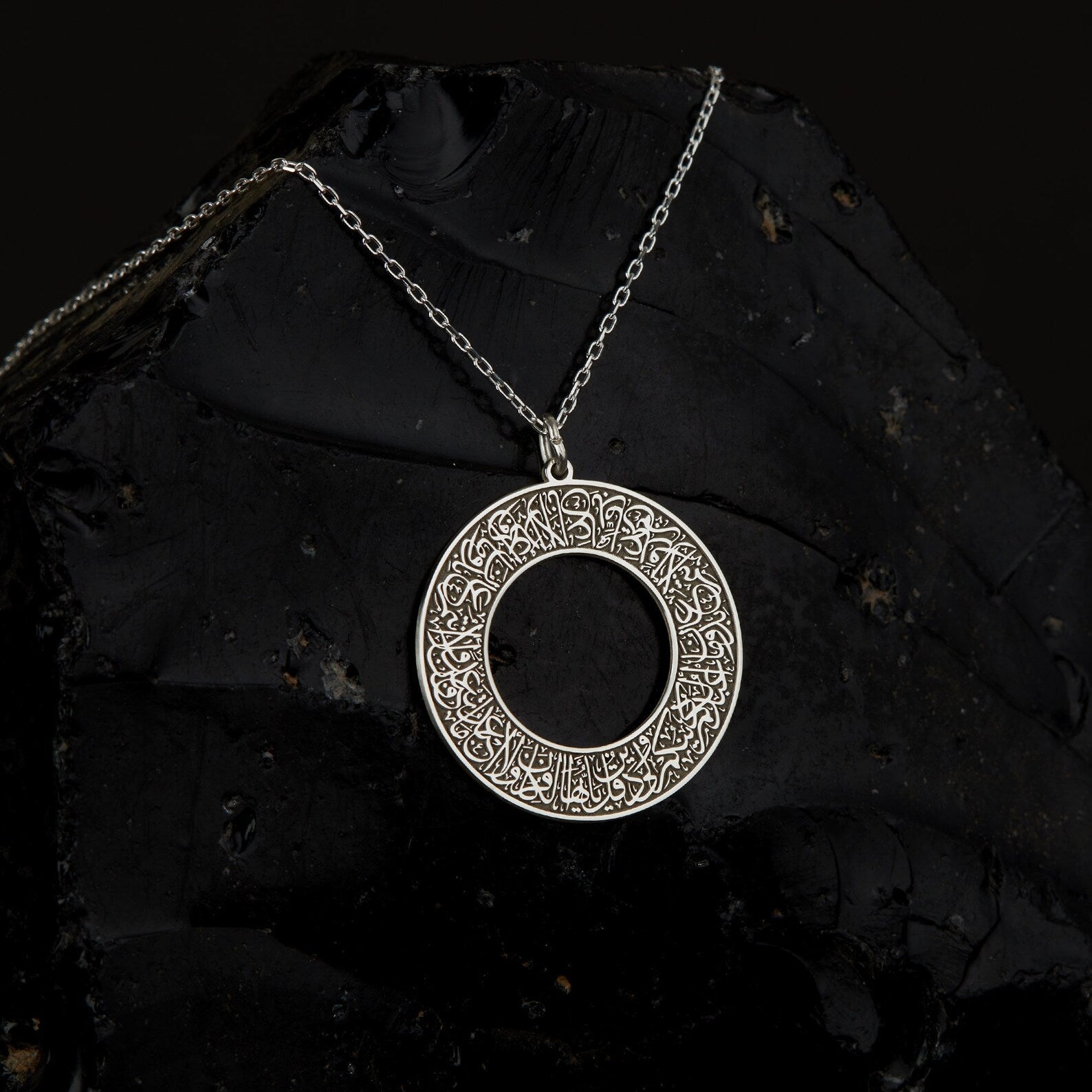 The Surah Al-Kafirun Necklace features a beautifully crafted design inspired by the Quranic verse from Surah Al-Kafirun. This verse emphasizes the theme of religious tolerance and unity, making it a meaningful and powerful piece of jewelry. The necklace is often designed with Arabic calligraphy, showcasing the verse's spiritual significance, and serves as both a decorative and inspirational accessory for those who wear it.