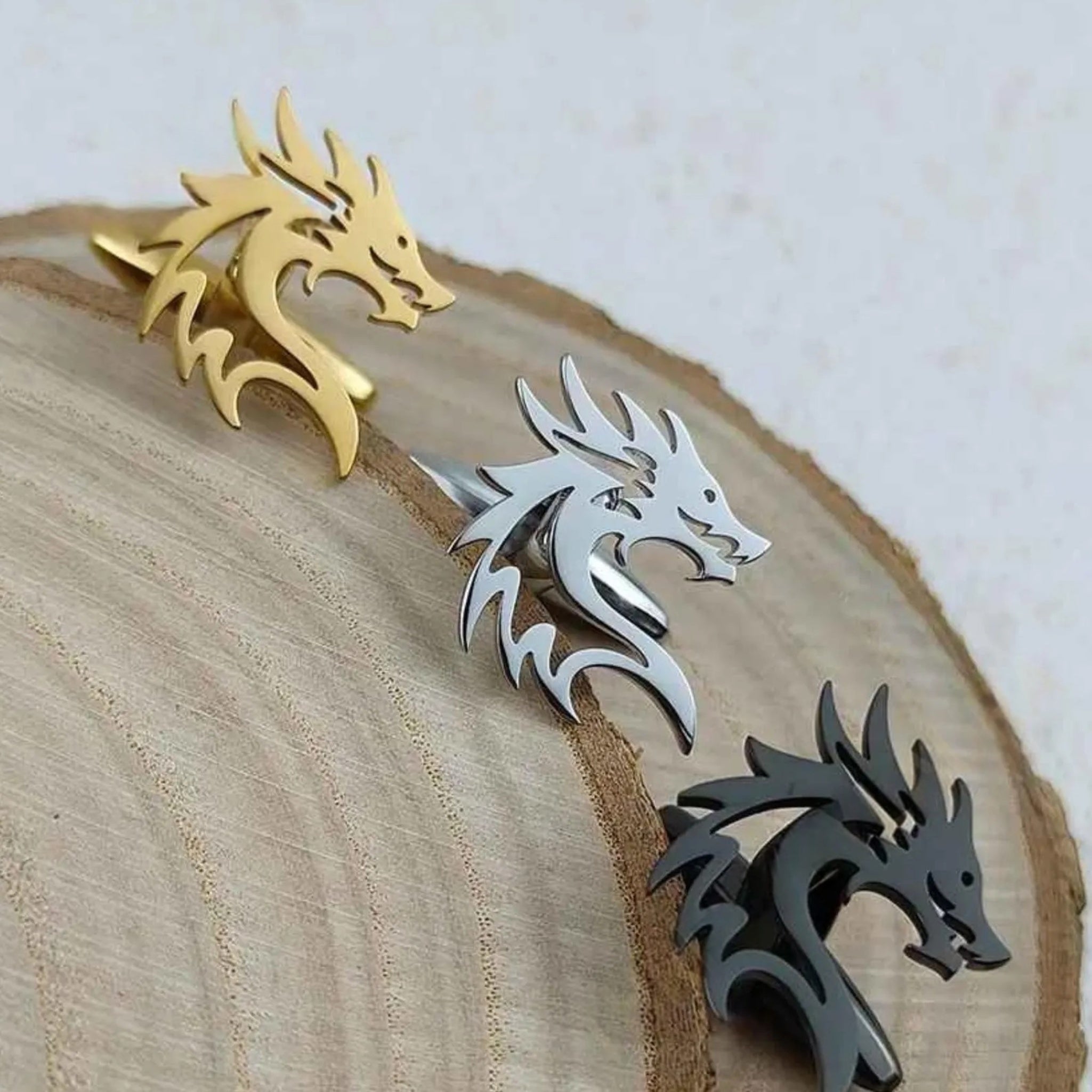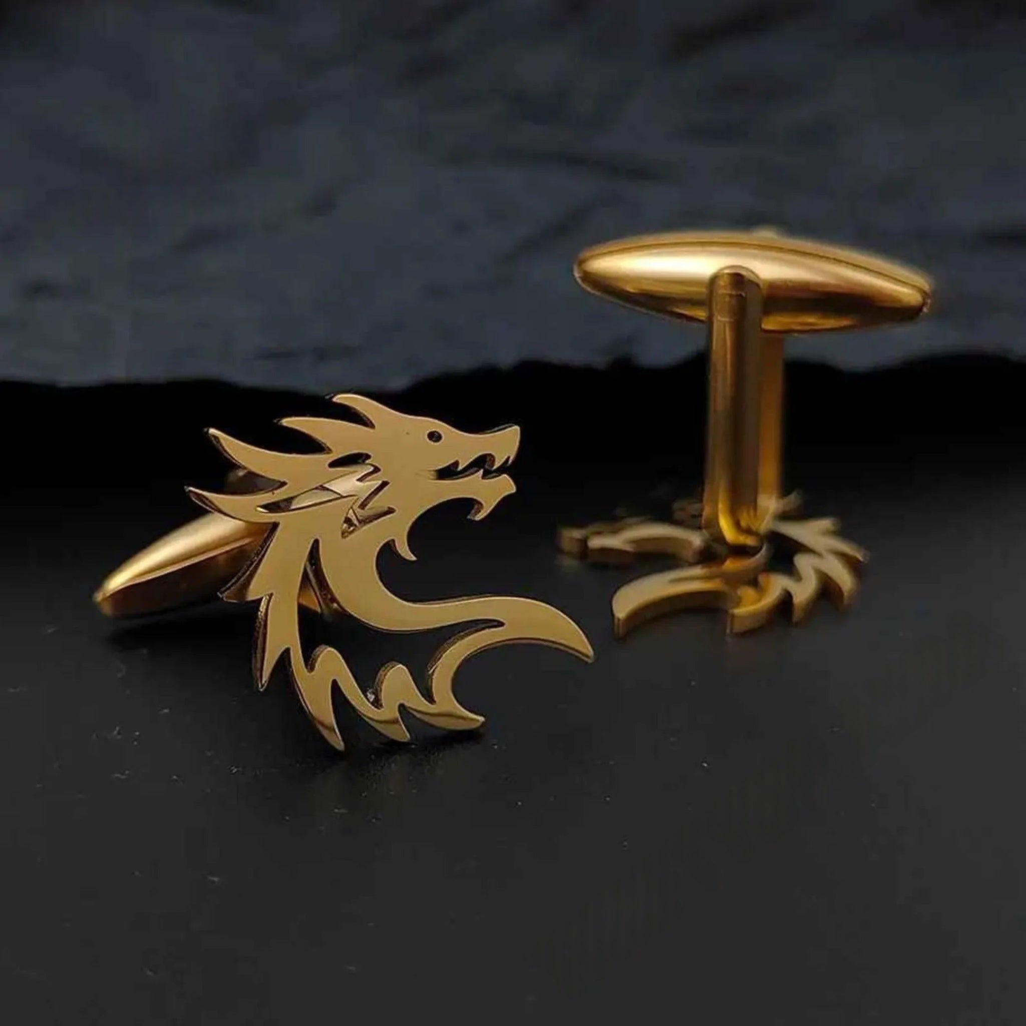 Unleash your inner strength and sophistication with these strikingly modern Dragon Head Cufflinks. Crafted from durable stainless steel with a gleaming gold-tone finish, these cufflinks feature a highly stylized, minimalist depiction of a majestic dragon's head. The design is bold yet refined, transforming a classic accessory into a powerful statement piece. Perfect for business meetings, weddings, or any formal event where you want to add a unique, confident touch to your attire.